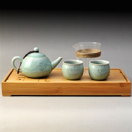 龙泉青瓷(弟窑.豆青釉)名家手工茶具:江山梅溪(带竹制茶盘)