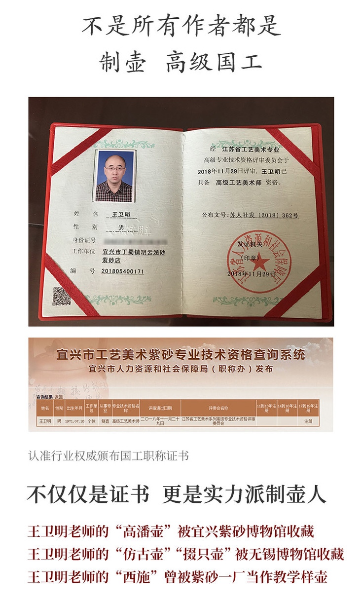 国家级高级工艺美术师,所制作品均以原矿泥全手工制作 自幼耳濡目染,酷爱紫砂艺术,经多位大师指点、督导,受益匪浅,从而在制作技法和创作理念上形成了自己的独特风格。所制作品均以原矿泥全手工制作。主要产品以朱泥为核心,工艺精湛、细致,具有明快秀气、端庄的风格,有高超的艺术表现力,所制作品多次荣获国内外金、银奖。 获奖及荣誉: 作品《事事如意》壶荣获2007年陶瓷实训基地手工大赛三等奖 作品《葵花醒狮》壶荣获中国天津艺术精品收藏博览会金奖,在2007年荣获新人新作优秀奖,并被无锡博物馆长久性收藏; 作品《田园秋色》壶荣获中国名茶博览会及首届碧螺春文化节中国紫砂艺术精品展银奖 作品《菱花如意》壶荣获2008年陶艺创作展评活动优秀奖 作品《情投意合》壶荣获2009年手工制陶大赛优秀奖,还获(国家级)工艺美术大师精品博览会金奖 作品《水中花》壶荣获2008年宜兴陶瓷传统制作技艺大赛优秀奖 作品《高潘》壶,该作品已被中国宜兴紫砂博物馆收藏 作品《仿古》壶和作品《掇只》壶已捐赠于无锡博物馆,并由其长久收藏 |